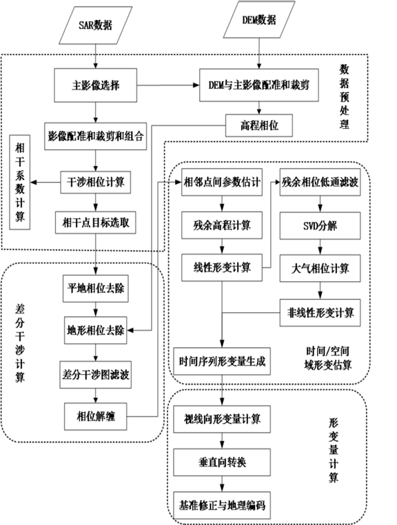 自上世纪80年代初,以美国SEASAT雷达卫星数据为研究对象开启干涉测量技术研究以来,以雷达相位干涉测量为代表的遥感技术为空间大地测量、全球及区域尺度的地形测绘与形变监测提供了新的方法与手段,改变了以往依靠水准、GPS等点位测量方式在空间测量点密度、监测范围和重复观测频率上的不足。二、时序InSAR监测地表形变技术流程基于重复轨道的合成孔径雷达差分干涉测量(DInSAR)技术以其短周期,广覆盖,低成本的优势,自问世以来就被后人积极地研究并应用着,但是传统DInSAR技术易受由时间空间失相关引起的相位噪声和大气延迟效应的干扰,降低形变测量结果的可靠性。为了克服这些限制因素的影响,一些崭新的以永久散射体技术和小基线集技术为代表的时间序列InSAR技术陆续被提出,它们的共同点是对那些在时间序列保持稳定散射特性的像元进行分析。目前相关的研究方法主要有最小二乘(LS)方法、永久散射体(PS)方法、小基线集(SBAS)方法、相干目标方法(CT)以及最新的SqueeSAR分布散射体干涉方法。下图给出了基于相干点目标时序InSAR形变监测的一般技术流程。